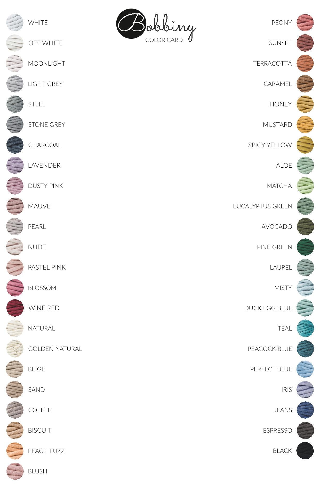 Ihr könnt die verschiedenen Farben der Bobbiny Garne wunderbar miteinander kombinieren. Bobbiny PREMIUM Flechtkordel 3mm geflochten haben einen Baumwollkern und können aufgrund der Beschaffenheit nicht ausgekämmt oder ausgefranst werden.